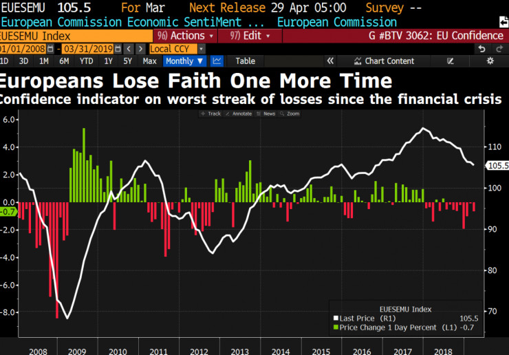 В своето месечно проучване ЕК заяви, че показателят за икономическото доверие в 19-е страни, които споделят еврото, се е понижил до 105,5 пункта през март от 106,2 през февруари. Спадът е по-голям от очакванията на икономистите за ниво от 105,9 пункта.