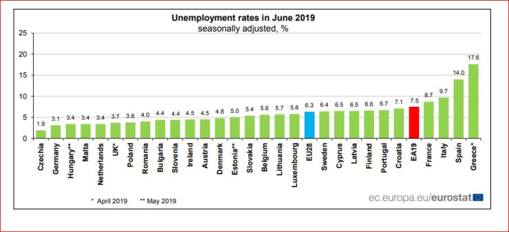 Според Евростат през юни 2019 г. в ЕС28 общо 15,674 милиона мъже и жени са били безработни, включително 12,377 милиона души в еврозоната. В сравнение с май 2019 г. броят на безработните лица намалява в ЕС28 с 36 000, а в еврозоната - с 45 000. В сравнение с юни 2018 г. броят на безработните в ЕС спада с 1,205 милиона, а в еврозоната - с 1,032 милиона.