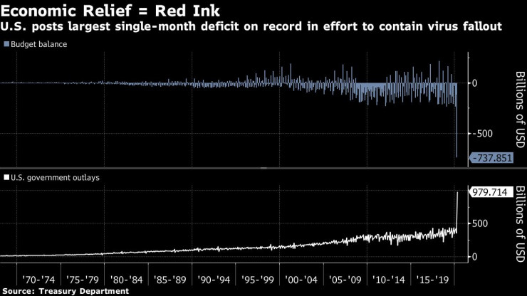 И така - федералният бюджет е бил на червено със 737,9 млрд. долара миналия месец. Тази сума е повече от три пъти над предишния рекорден месечен дефицит от 235 млрд. долара, който бе отчетен през февруари. Досега дефицитът за фискалната година, започнала на 1 октомври, достига 1,48 трлн. долара.