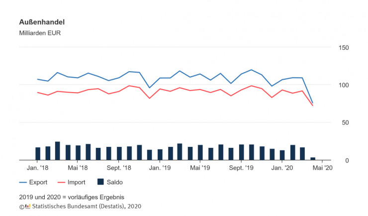 Поради причинената от коронавируса рецесия при много важни търговски партньори германският износ се понижава през април с невиждани досега темпове. Стойността на износа на стоки е спаднала с 31,1 процента на годишна база до 75,7 милиарда евро, както обяви Федералната статистическа служба във Висбаден във вторник.