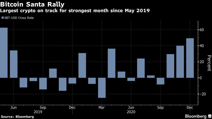 Биткойнът поскъпна с 50% през декември и се готви да запише най-големия си месечен ръст от май 2019 г.