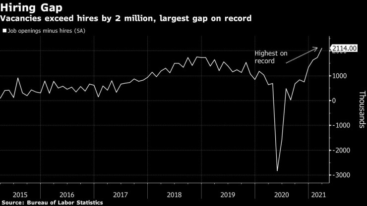 Броят на свободните работни места надвишава новите наемания с над 2 млн. – най-голямата разлика, регистрирана някога, и показват трудностите пред настоящия пазар на труда. Много работодатели казват, че не могат да намерят служители за свободните си позиции заради страховете от зараза с коронавирус, трудности при отглеждането на деца и щедрите помощи за безработица.