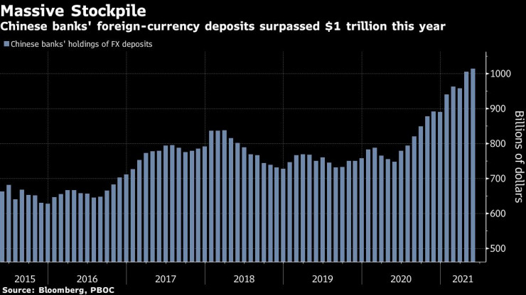 Средствата се натрупаха, докато пандемията засили търсенето на китайски стоки, увеличавайки приходите във валута на износителите. В същото време устойчивата икономика и силната местна валута привлякоха чужди инвеститори, които продават долари за юани, за да инвестират в китайски акции и облигации. Банковите депозити в чужда валута са се увеличили с над 260 млрд. долара за годината до май – най-много, откакто започва събирането на данните през 2002 г.