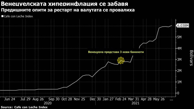 За последно Венецуела извърши „деноминация“ на боливара през 2018 г. а през март започна да печата банкнота от 1 милион боливара, най-голямата в историята на страната. Но тази банкнота сега струва само 0,32 долара и не е достатъчна, за да си купите чаша кафе. От 2008 г. правителството - първо на покойния Уго Чавес, а след това на настоящия президент Николас Мадуро - премахна 8 нули от валутата, тъй като хиперинфлацията изтри спестяванията на хората.