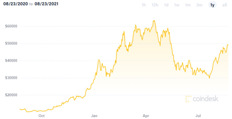 Стойността на биткойна достигна до най-високото си равнище в средата на април от близо 65 хил. долара, стимулирана от интереса на институционалните инвеститори. По-късно обаче серия от отрицателни коментари потопиха цената, комбинирани с някои регулаторни ограничения в Китай. Последното дъно на криптовалутата бе под 30 хил. долара от края на юли.