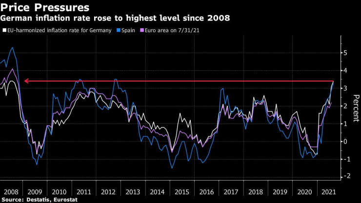 Нехармонизираните стойности за август са на ниво от 3,9%, което е най-много от декември 1993 г., когато икономиката преживя бум след обединението на страната.