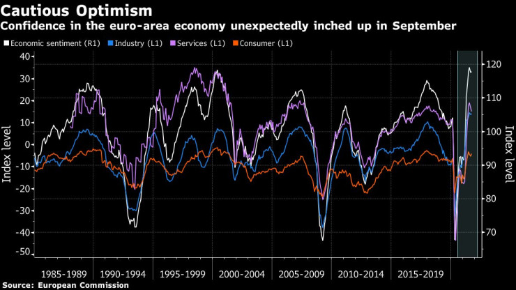 Икономическото доверие в еврозоната неочаквано се повиши през септември, след като потребителите са станали по-оптимистично настроени, а строителните компании очакват перспективите през заетостта да се подобрят, съобщава Bloomberg.