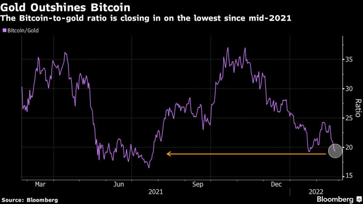 Съотношението биткойн/злато е на най-ниско равнище от средата на миналата година. Графика: Bloomberg