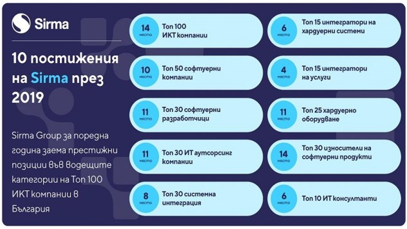 Сирма заема 14-та позиция сред всички технологични дружества, като пред нея са предимно чуждестранни компании или такива от други подсегменти на информационните технологии като хардуер и системна интеграция. Това я поставя в тройката на най-големите български софтуерни фирми. Сирма е класирана с две позиции по-напред, в сравнение с изданието на класацията през 2019 г.