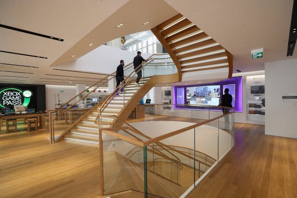 Триетажният магазин на Microsoft включва зала за гейминг с Xbob, специален McLaren, стаи за срещи с корпоративни клиенти и дигитална класна стая, където може да се учи програмиране.
