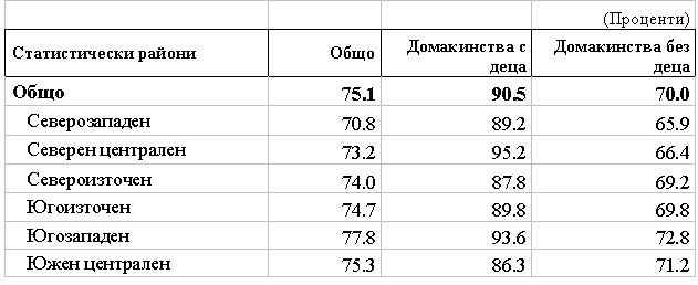 С най-висок относителен дял на домакинства с достъп до интернет е Югозападният район (77,8%), а с най-нисък е Северозападният район – 70,8%.