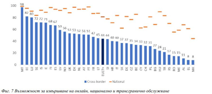 Това трансгранично предоставяне не е достатъчно развито като цяло на Стария континент. По този показател България е на 22 място сред 36-те обхванати в проучването държави, а това се дължи най-вече на липсата на работеща национална схема за електронна идентификация и признаването на чужди идентификации.