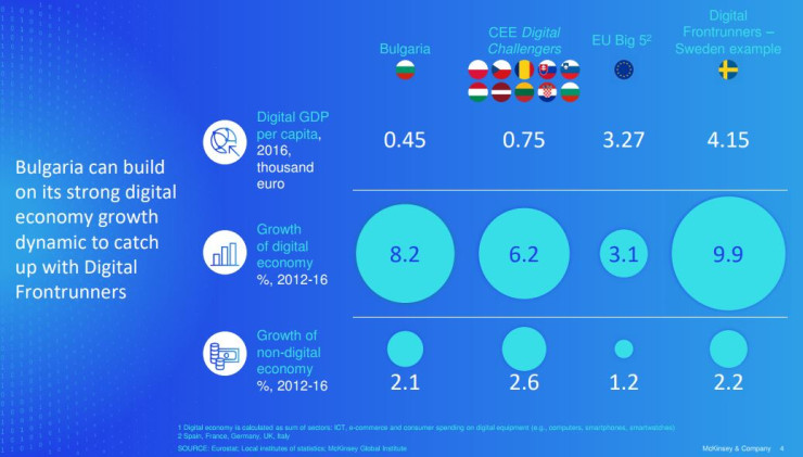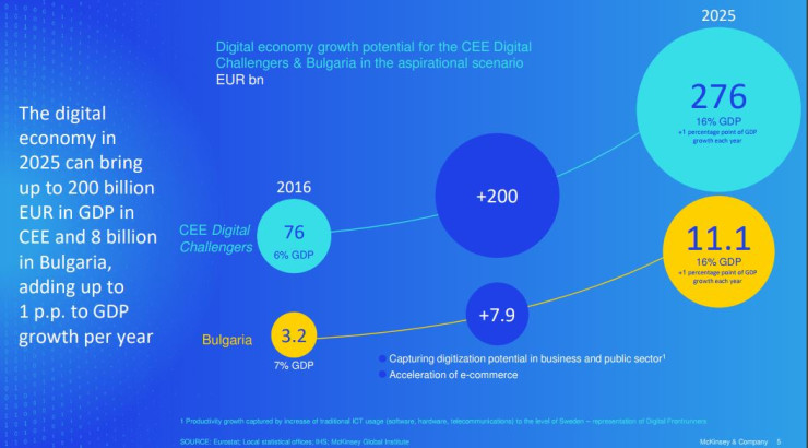 Дигитализацията може да бъде следващият голям двигател на растежа на България. С преодоляването на дигиталното изоставане от Западна и Северна Европа страната ни може да увеличи с до 8 млрд. евро брутния си вътрешен продукт до 2025 г. Това стана ясно от резултатите от последния доклад "Възходът на дигиталните конкуренти: Как дигитализацията може да се превърне в следващия двигател на икономическия растеж в Централна и Източна Европа" на глобалната консултантска компания McKinsey. Анализът измерва размера и темпа на растеж на дигиталните икономики на регионално ниво в десет държави: България, Латвия, Литва, Полша, Румъния, Словакия и Словения, Унгария, Хърватия, Чехия.