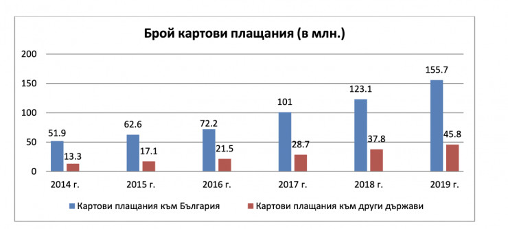 Промяна има и в България. Ако през 2015 г. е имало 62,5 млн. броя картови плащания в страната, през 2019 г. техният брой е 155,7 млн. Стойността също расте с бърз темп – от 3,7 млрд. лева през 2015 г. до 8,3 млрд. лева през 2019 г.