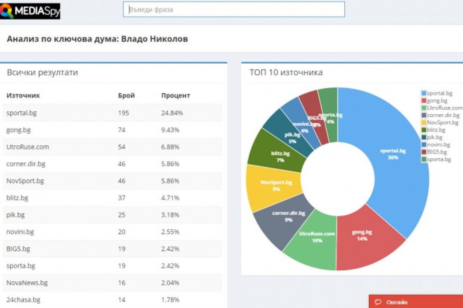 4. MediaSpy предоставя възможност за analytics и отчети – Share of Voice, Tone of Voice, #mentions/month/day, per media, per keyword, и други.
