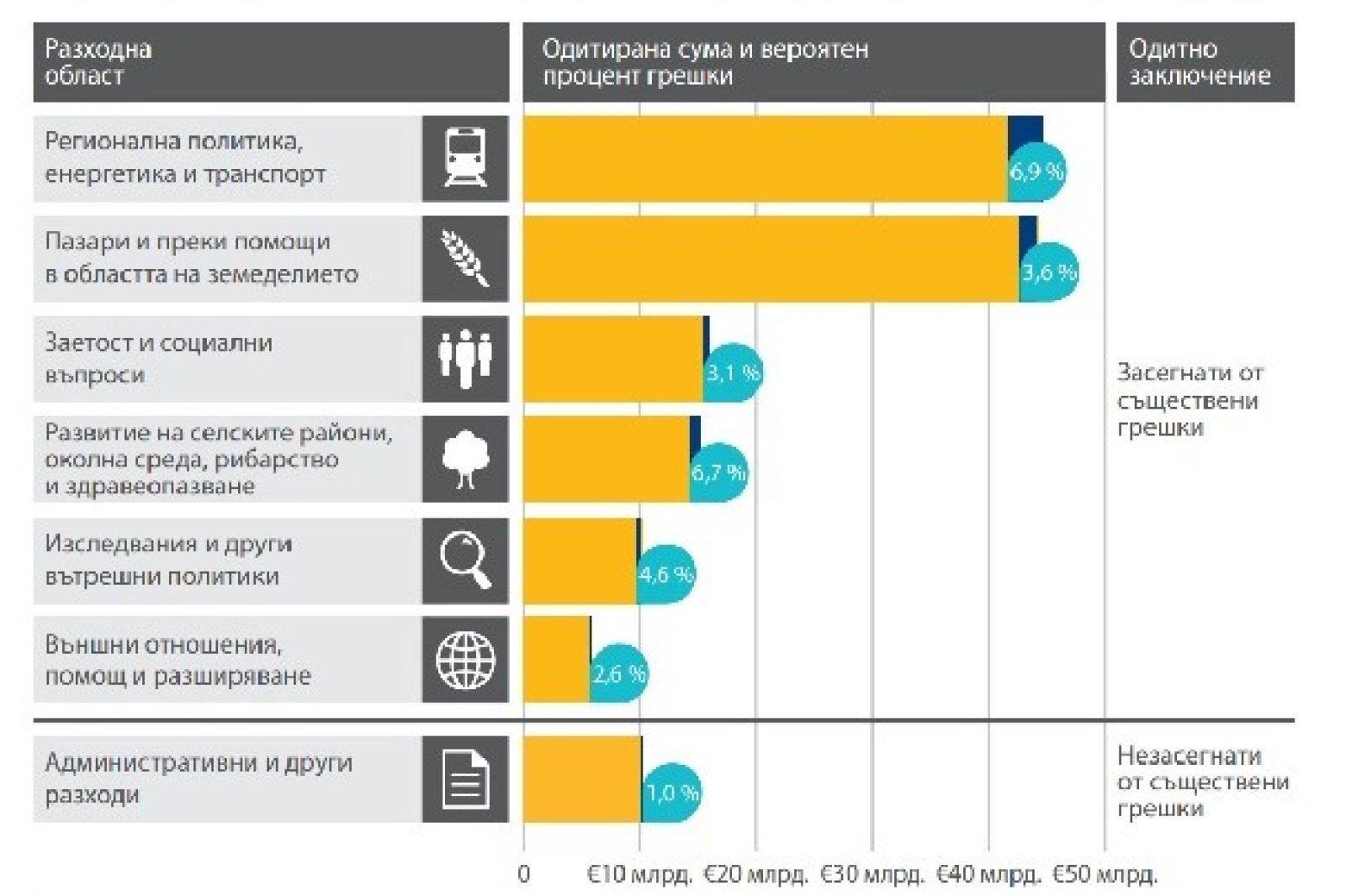 Европейската сметна палата съобщи, че две области, където най-често се допускат грешки с разходите, са регионалната политика с 6,9% и развитие на селските райони, рибарство и здравеопазване с 6,7%.