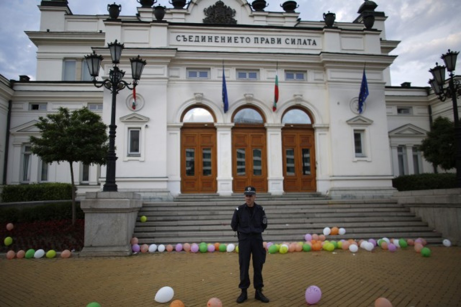 Пред сградата на Народното събрание част от шествието забави ход, за да „подари“ шарени балони с надпис „Оставка“ на депутатите.