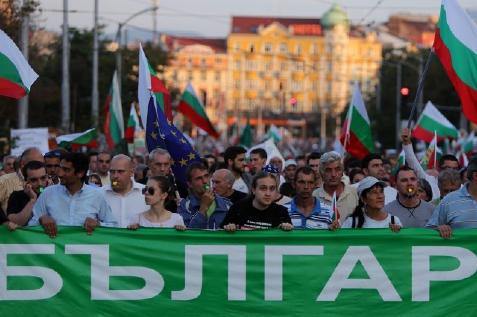 Недоволните хора, които се присъединяват към протеста срещу управляващите, са издигнали български знамена или носят лозунги с различни послания.