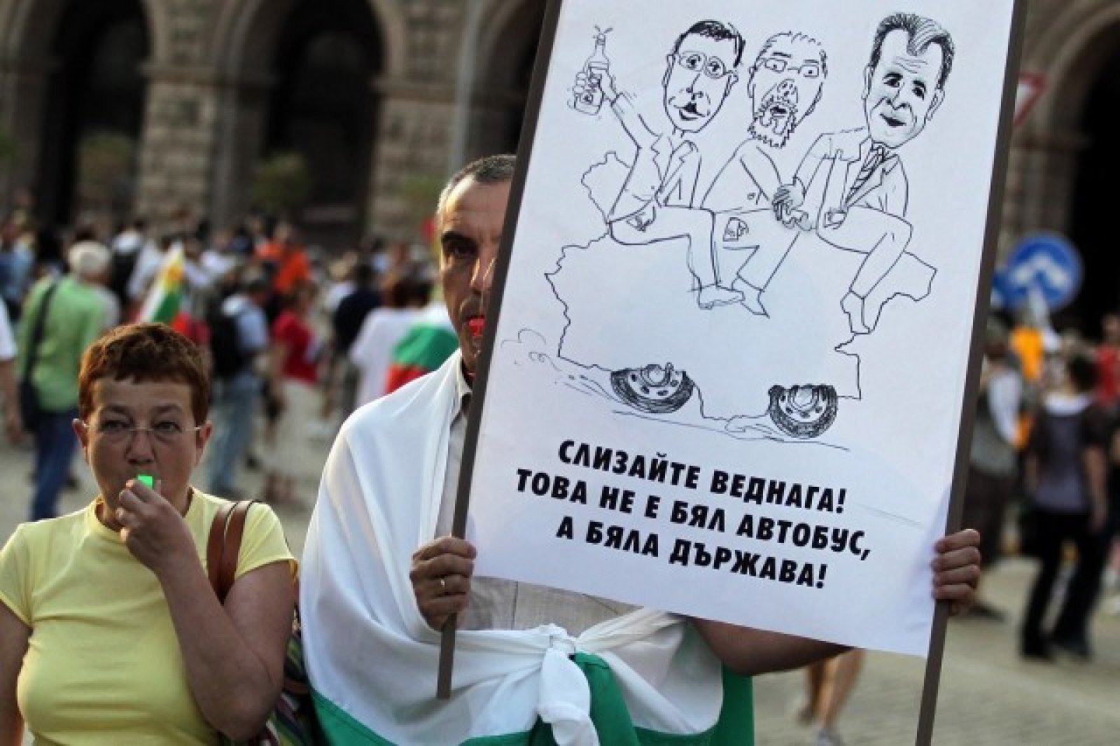 Междувременно протестното шествие се отправи към Народното събрание. Протестиращи носят направен от картон бял автобус, който символизира депутатския автобус, с който беше направен опит да бъдат изведени депутати и министри от парламента на 23 юли. На автобуса са сложени снимки на Мая Манолова, Цветлин Йовчев, Петър Чобанов, Михаил Миков и други. Някои от протестиращите залягат пред фалшивия автобус. Други участници в протеста, които играят ролята на полиция, се правят, че удрят протестиращите с палки.