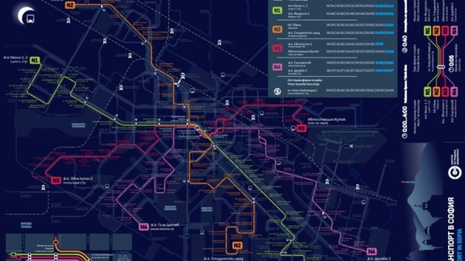 Нощните линии са четири и се пресичат в центъра на града така, че да се осигури връзка с всички квартали.