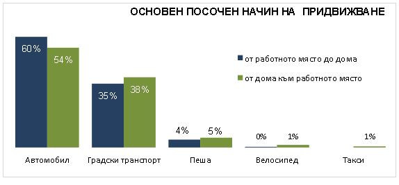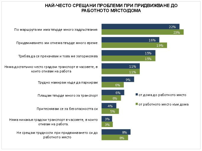 Като основни проблеми при придвижване и в двете посоки, към и от работното място, анкетираните посочват задръстванията, времето на придвижване, прекачването, нередовния градски транспорт, липсата на места за паркиране.
