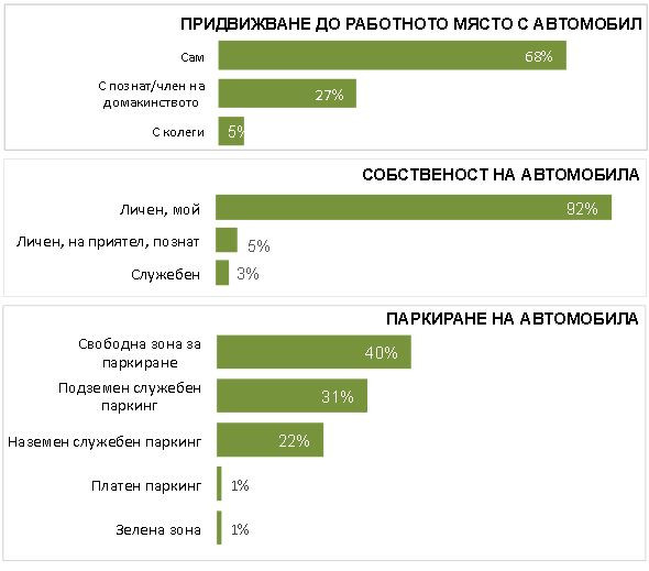 Най-голям, повече от две трети е делът на шофьорите, които ползват сами автомобила си за предвижване до работното място. Едва около една четвърт са тези, които се придвижват заедно с познат или член на домакинството им.
