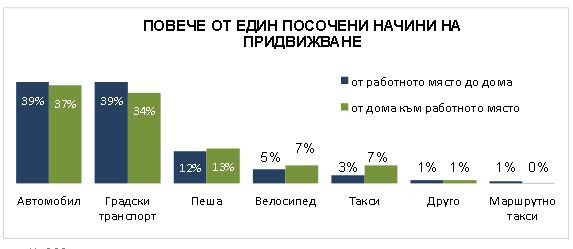 Анкетата установява, че като цяло не се използва само един вид транспорт. Често пъти, в рамките на един ден, се комбинират различни начини на придвижване, като вариациите се обуславят основно от локацията на компанията, предмета ѝ на дейност, средната възраст на работещите, сезона, наличието на деца в домакинството, които да бъдат водени на училище/детска градина и т.н.