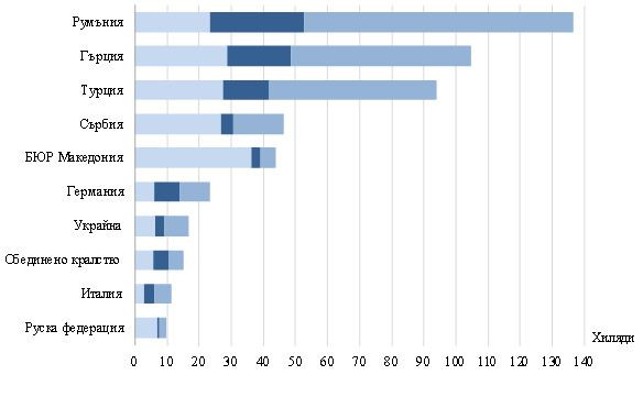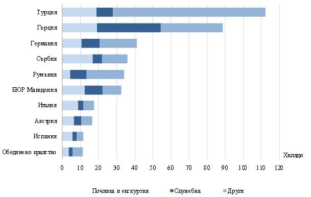 През декември най-голям е броят на пътуванията към Турция – 112,2 хиляди, Гърция – 88,8 хиляди, Германия – 41,2 хил., Сърбия – 36,1 хиляди, Румъния – 34,2 хил., бившата югославска република Македония – 32,8 хил., Италия – 17,6 хил., Австрия – 16,6 хил., Испания – 11,6 хил., Обединеното кралство – 11,4 хиляди.