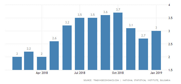 Годишната инфлация в България през първия месец на 2019 година тръгва нагоре, ускорявайки се до 3% след достигнатото 7-месечно дъно в края на 2018 година, става ясно от последните данни на Националния статистически институт (НСИ), публикувани днес.
