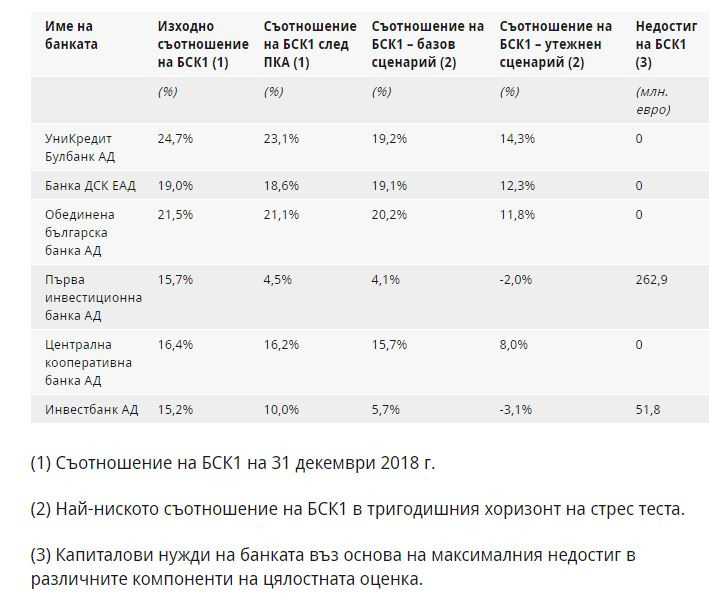 От друга страна, резултатите на „Първа инвестиционна банка“ АД попадат под прага за съотношението на БСК1 от 8%, използван както в преглед на качеството на активите, така и в базовия сценарий на стрес теста, а също и под прага от 5,5% в утежнения сценарий на стрес теста. Същевременно резултатите на „Инвестбанк“ АД попадат под прага за съотношението на БСК1 от 8%, използван в базовия сценарий на стрес теста, както и под прага от 5,5% в утежнения сценарий на стрес теста.