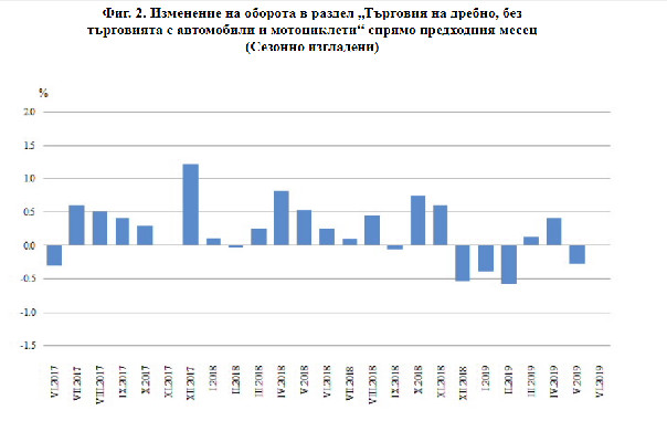 Спрямо предходния месец намаление на оборотите има при търговията с автомобилни горива и смазочни материали и търговията на дребно с нехранителни стоки - съответно с 0,5 и 0,4%, докато при търговията на дребно с хранителни стоки, напитки и тютюневи изделия е регистриран ръст с 1,2%.