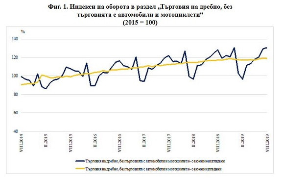 От предварителните сезонно изгладени данни за август на Националния статистически институт (НСИ) се вижда, че оборотът в раздел „Търговия на дребно, без търговията с автомобили и мотоциклети“ по съпоставими цени намалява с 0,3% спрямо предходния месец.