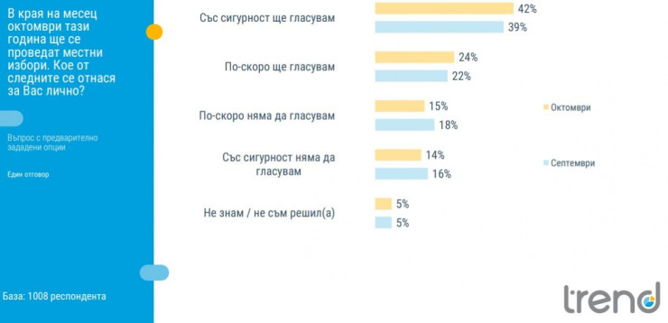 В навечерието на местните избори 42% от всички български граждани декларират, че със сигурност ще гласуват, докато малко под една четвърт (24%) заявяват, че по-скоро ще упражнят правото си на глас. Предизборната кампания дава своя резултат, като сравнението между същия въпрос през септември и този през октомври регистрира малко по-силна мобилизация. В разбивката по партийни симпатии ясно личи силната мобилизация на привържениците на ГЕРБ, БСП и ДПС. Това показват данните от проучване на социологическата агенция "Тренд", направено между 1 и 10 октомври с анкета сред 1000 души по поръчка на "24 часа".