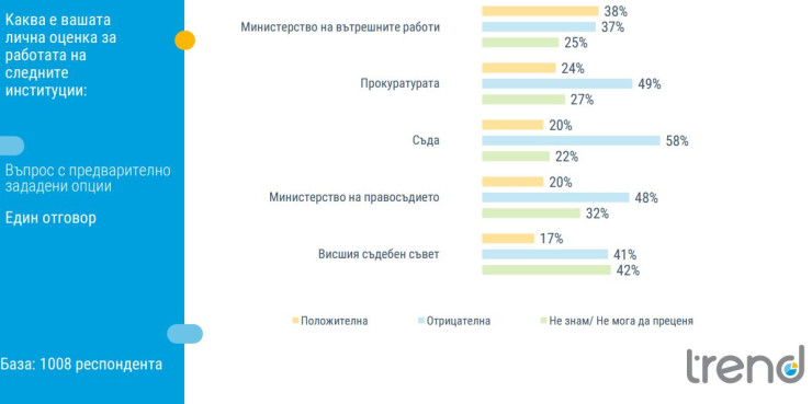 С най-висока положителна оценка за работата си се ползва Министерството на вътрешните работи, като МВР е единствената от тестваните институции, където положителната оценка надвишава, макар и минимално, отрицателната. Съдът е институцията с най-голямо натрупване на отрицателни оценки, а за работата на Висшия съдебен съвет най-голям дял нямат мнение.