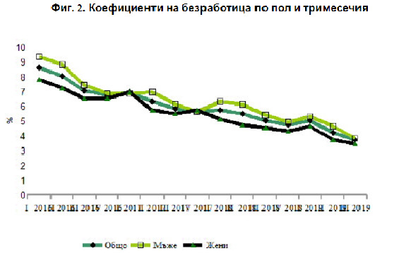Безработицата продължава да намалява и през третото тримесечие на 2019 година, като на годишна база спада с още 1,3 процентни пункта до 3,7%, показват данните на Националния статистически институт (НСИ). Коефициентът на безработица за мъжете е 3,8%, а за жените - 3,4%.