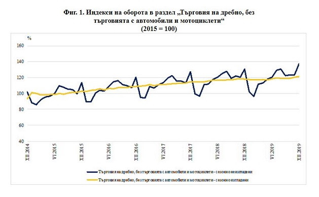 Спрямо предходния месец оборотите в раздел „Търговия на дребно, без търговията с автомобили и мотоциклети“ по съпоставими цени нарастват с 0,7% по предварителни сезонно изгладени данни.