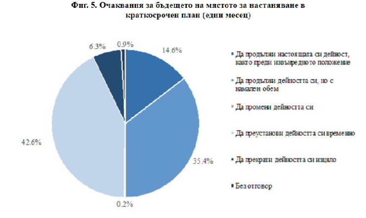 По отношение на бъдещата активност на мястото за настаняване в краткосрочен план 42,6% от ръководителите очакват временно да преустановят дейността си, 35,4% смятат да продължат да работят макар и с намален обем, а 14,6% очакват да продължат дейността си, както преди извънредното положение. Едва 6,3% прогнозират да я прекратят.