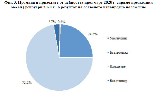 През март по-голяма част от управителите (72,2%) съобщават за намаление в приходите от дейността си спрямо предходния месец, а 24,5% от тях посочват, че няма промяна.
