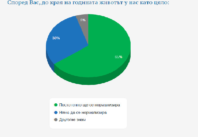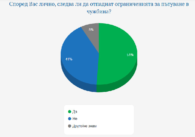 Растат очакванията за постепенна нормализация и завръщане към обичайния ритъм на живот в страната. 51% от българите смятат, че ограниченията за пътуване в чужбина вече трябва да отпаднат. 41% не са съгласни. Останалите се затрудняват да отговорят. Близо две трети от българите пък вярват, че до края на годината животът в страната постепенно ще се нормализира. 30% са по-скоро скептични, че ще се върнем към „нормалността“ до края на 2020 г., а 5% от запитаните не могат да преценят.