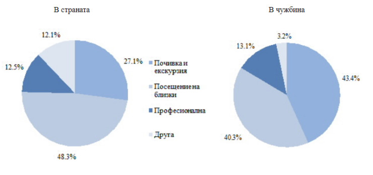 По-голямата част от туристическите пътувания на лицата на възраст 15 и повече навършени години в страната са били с цел „посещение на близки“, докато тези, реализирани в чужбина, са за „почивка и екскурзия“, посочени съответно от 48,3 и 43,4% от тях.