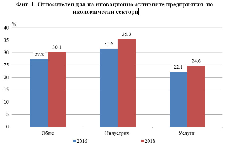 Според данните иновационната активност на предприятията в страната се увеличава слабо в периода 2016 - 2018 г. в сравнение с 2014 - 2016 г. Нарастването е с 2,9 пункта (от 27,2 на 30,1%). Ръст се наблюдава както при предприятията в индустриалния сектор, така и при тези в сектора на услугите - съответно с 3,7 и 2,5 пункта.