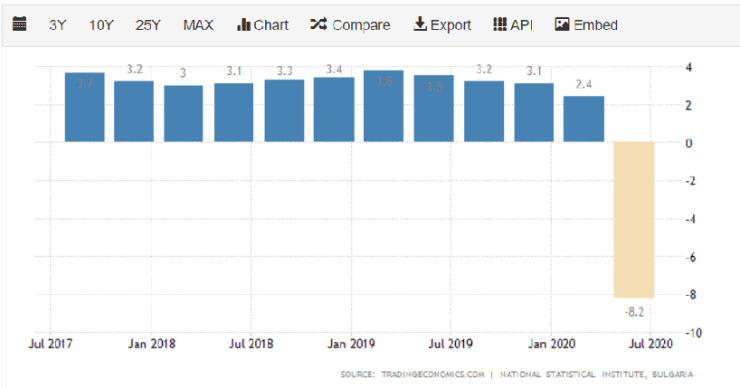 Българската икономика изглежда се представя сравнително добре в сравнение с повечето други икономики на ЕС през второто тримесечие на 2020 г. Въпреки това въздействието на пандемията върху българската икономика през второто тримесечие на 2020 г. става все по-негативно. Сигналите за забавяне на икономиката от първите три месеца прерастват в сериозен спад през второто тримесечие на фона на свиване на вътрешното потребление и срив при износа на стоки и услуги, става ясно от първоначалните данни на НСИ.