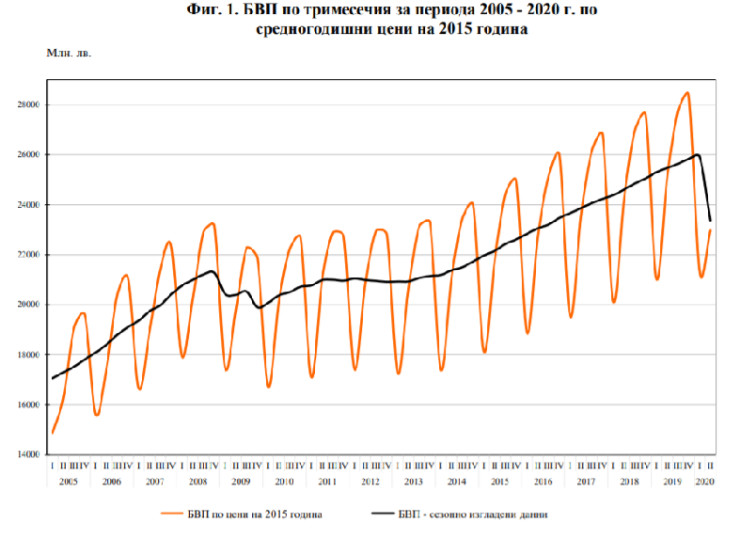 След като брутният вътрешен продукт на България нарасна с 2,4% на годишна база през първото тримесечие на 2020 г., след ръст от 3,1% през предходното тримесечие, което бе най-бавният темп на разрастване от третото тримесечие на 2014 г., то през второто тримесечие БВП намалява с 8,2% спрямо съответното тримесечие на предходната година и с 9,8% спрямо първото тримесечие на 2020 г. според сезонно изгладените данни.