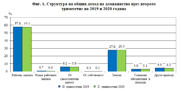 За април-юни 2020 година с най-висок относителен дял продължава да e доходът от работна заплата (57,5%), следван от доходите от пенсии (28,3%) и от самостоятелна заетост (5,9%). На годишна база обаче доходът от пенсии нараства с 0,7 процентни пункта, а постъпленията от работна заплата и самостоятелна заетост намаляват с по 0,3 процентни пункта, вижда се от данните на националната статистика.