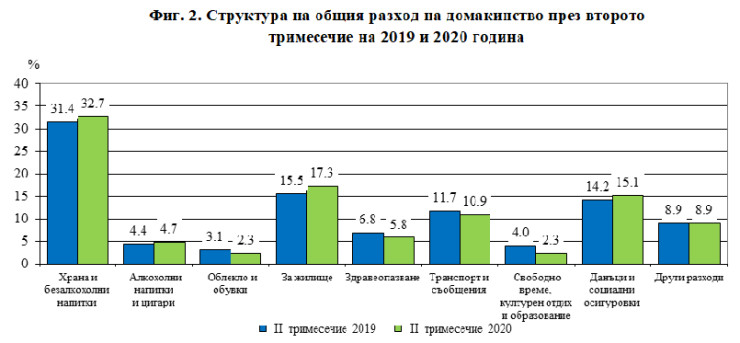 Общият разход на лице от домакинство през второто тримесечие на 2020 г. е 1384 лв. и намалява с 1,3% на годишна база. Най-голям дял от разходите на домакинствата продължават да са тези за храна и безалкохолни напитки (32,7%), следвани от разходите за жилище (17,3%), данъци и социални осигуровки (15,1%) и разходите за транспорт и съобщения (10,9%).
