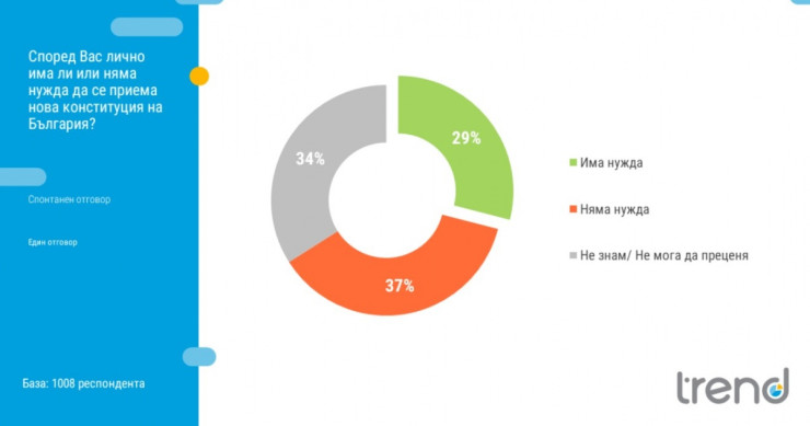 На въпрос има, или няма нужда да се приема нова Конституция на България, над една трета отговарят с „не знам/не мога да преценя“, 29% са на мнение, че има нужда от промяна на основния закон на държавата, а 37% от интервюираните са убедени, че няма такава необходимост.