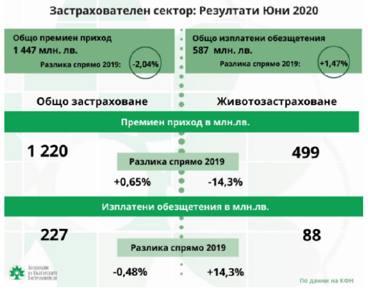 Данните общо за застрахователния пазар показват постепенен тренд към възстановяване. Премийният приход общо за пазара за юни 2020 г. е 1,447 млрд. лв., с 2,04% по-нисък от същия период за 2019 г. За сравнение, намалението на премийния приход на годишна база за април е 2,58%, а за май - 3,48%. Общият размер на изплатените обезщетения достига 587 млн. лв., като нарастването на годишна база е 1,49%.