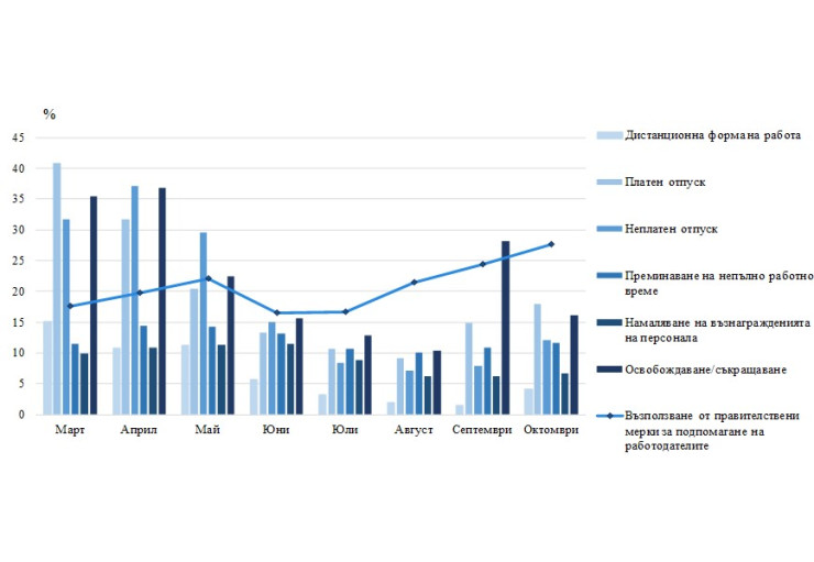 Анкетата показва увеличение на ръководителите, които са предложили на персонала си „платен отпуск“, „неплатен отпуск“, „преминаване на непълно работно време“. Сред другите мерки са „намаляване на възнагражденията на персонала“ и „дистанционна форма на работа“.