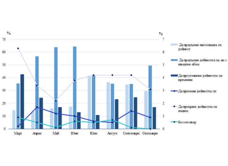 Анкетата сред мениджърите през октомври показва, че в краткосрочен план 49,5% от тях смятат да продължат с настоящата си дейност макар и с намален обем, 29,7% са сигурни, че ще продължат да работят, 16,8% предвиждат временно да преустановят дейността си, а 3,1% прогнозират да я прекратят.