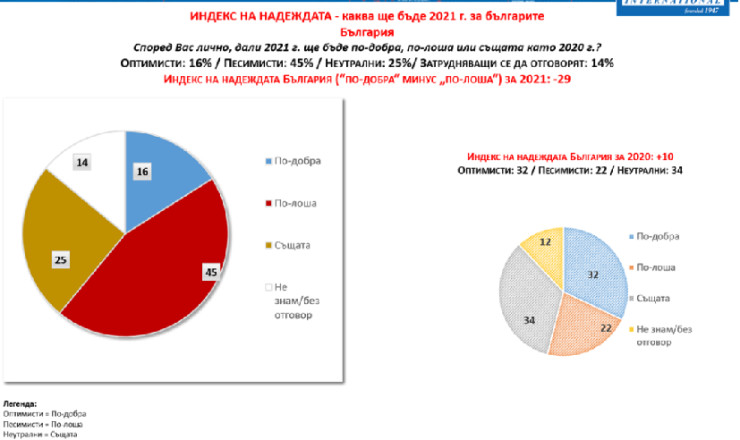 В България надеждата за по-добра 2021 г. е по-скоро крехка. 16% от запитаните българи вярват, че предстоящата година ще е по-добра от пандемичната 2020 г., за 45% обаче тя ще е дори по-лоша, една четвърт очакват да е същата, а останалите не могат да преценят. Така страната ни се нарежда сред топ 5 на песимистите по света заедно с Италия, Хонконг, Полша и Южна Корея. Българите изглеждат силно песимистични и на фона на останалите държави от ЕС, където обобщеното ниво на песимизъм е 31% от всички запитани, а на оптимизъм – 35%.